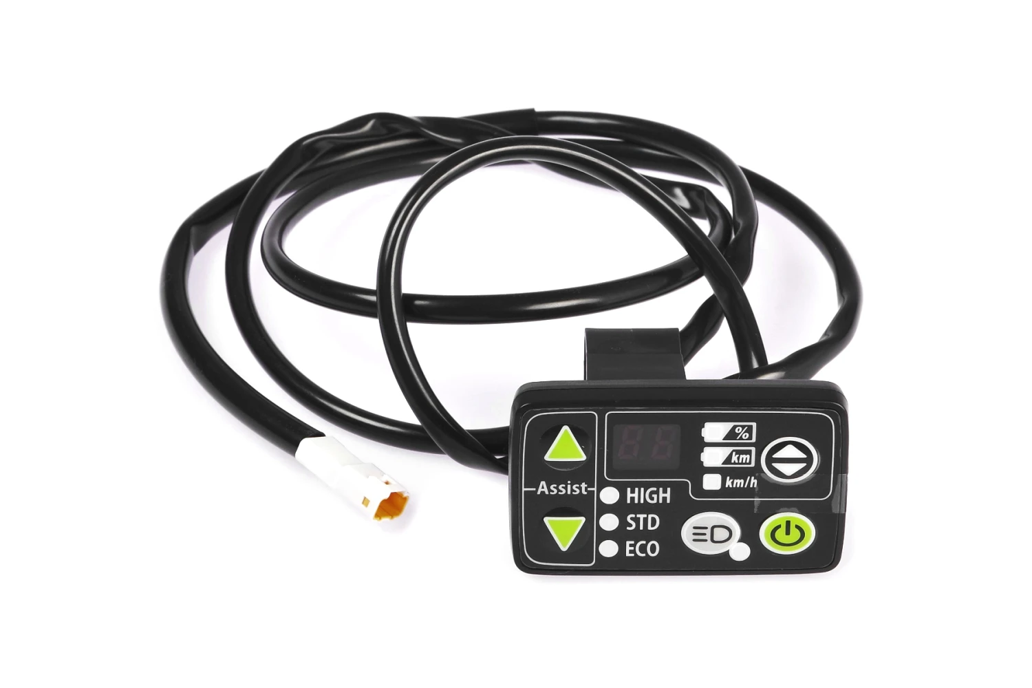 Über das Display lassen sich drei wählbare Unterstützungsstufen einstellen: High, Standard oder Eco. Es ermöglicht außerdem das Ein- und Ausschalten des Systems und die Aktivierung der Fahrradbeleuchtung. Das Yamaha LED-Display gibt über eine Digitalanzeige Auskunft über Batteriestand und Geschwindigkeit.